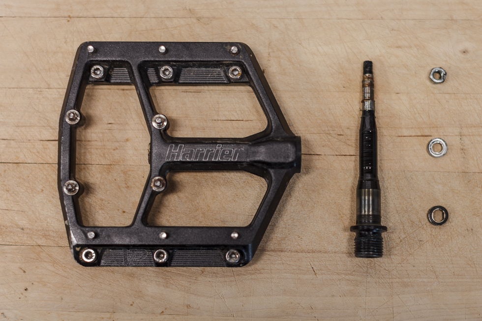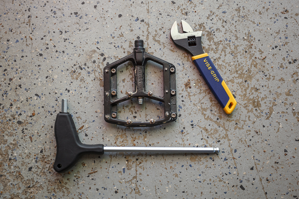 Using an 8mm allen key to remove the pedals is much easier than the traditional 6mm hex key most pedals require. Most multi-tools include an 8mm allen key, so you should be covered when removing the pedals for traveling or extended hike-a-bike. The Harriers require an 8mm allen key and an 8mm wrench to be serviced. Servicing them is very straight forward. Remove the axle, clean it, apply some grease and re-pack it in, done.