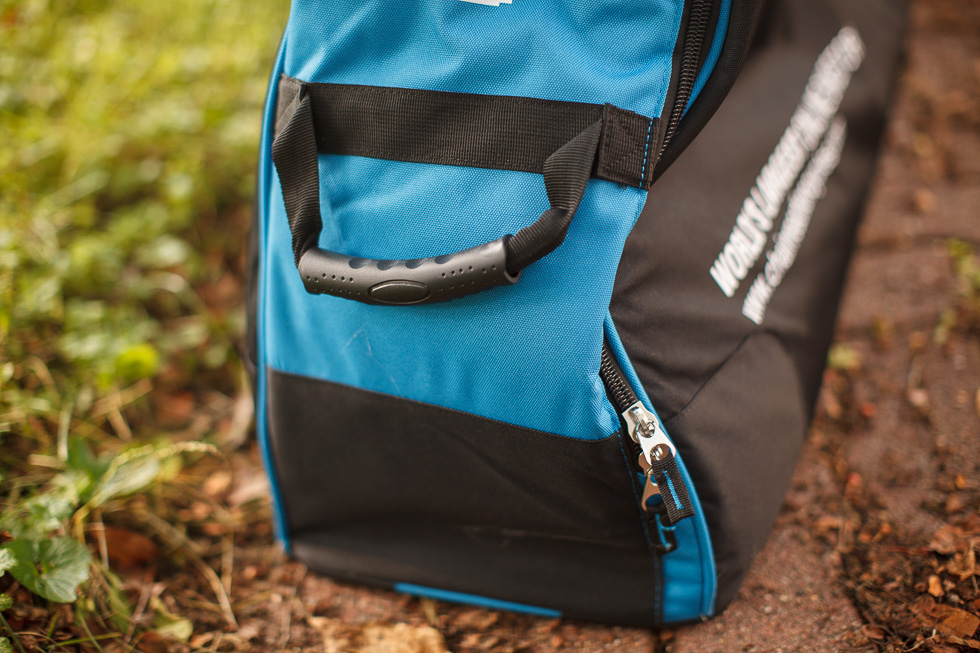 The bag is equipped with burly handles in the front, back, and sides. The side handles make it easier to lift the bag when you need to load it into a car trunk or the belly compartment of a bus.