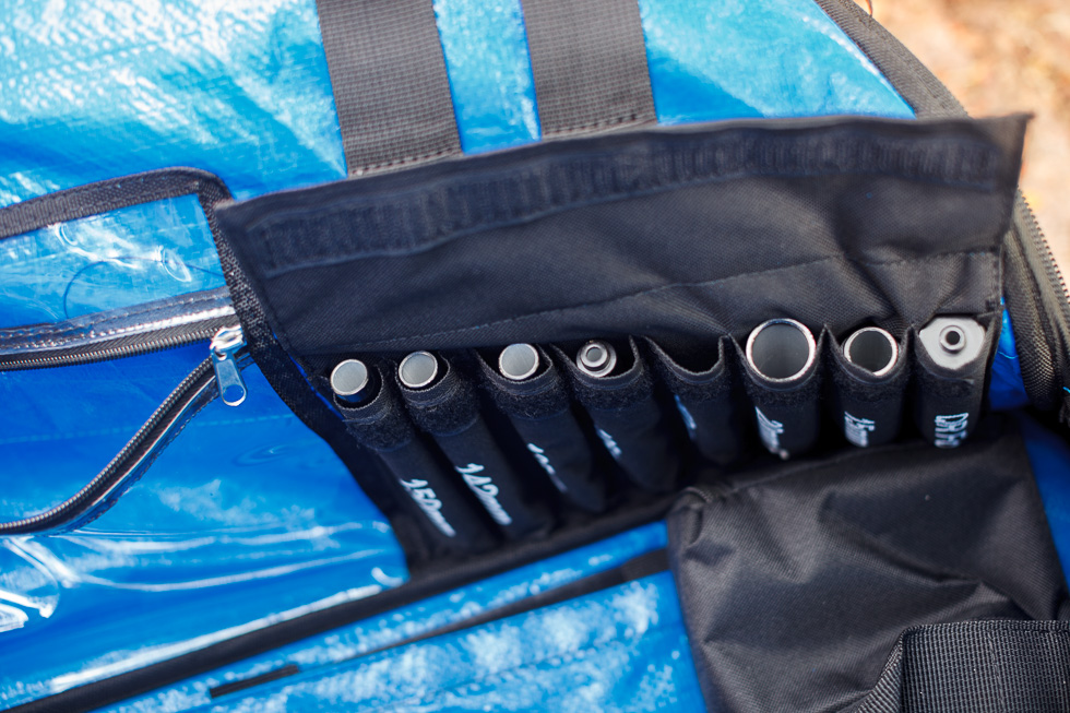 Funny that the 130mm spacer fit my 135mm-spaced Salsa Fargo just fine. This might explain why I always have a little bit of a hard time sliding the back wheel into the dropouts. I’m glad the bag comes with different spacer sizes. The dedicated pockets make it easy to store the spacers when not in use. I do remove all the spacers from the bag to make it a little bit lighter; there’s no need to have all the spacers inside the bag during transport.